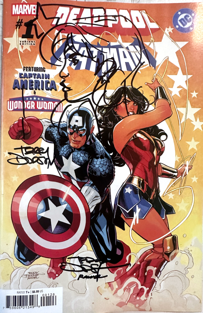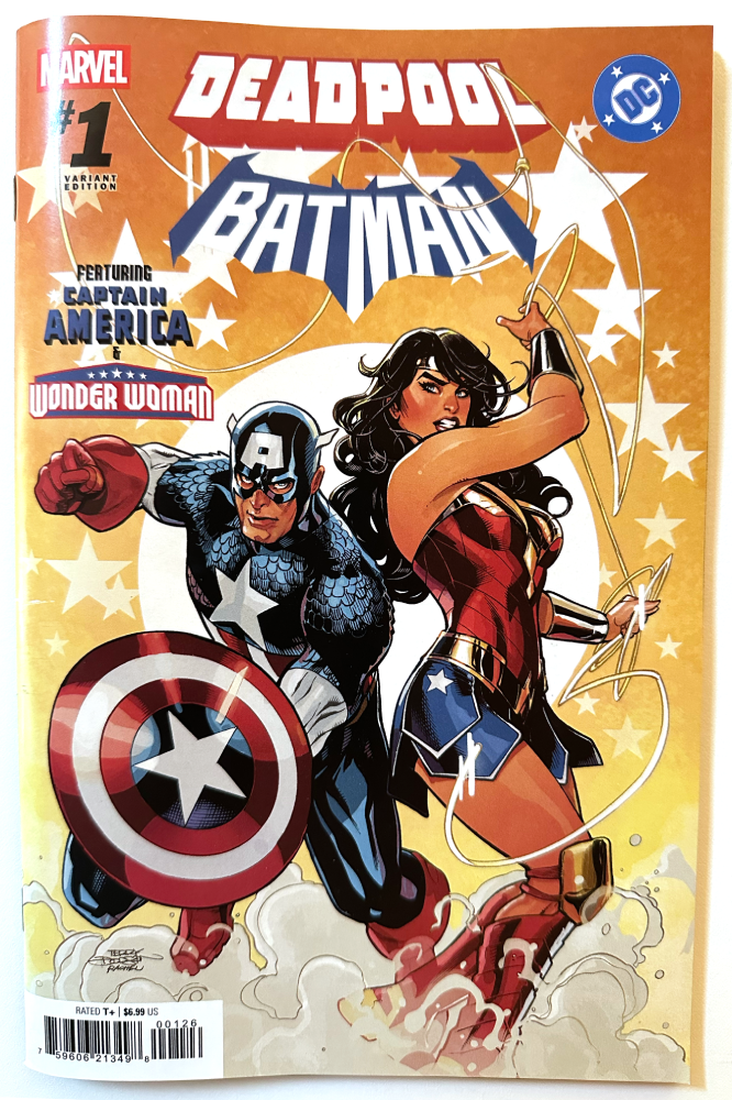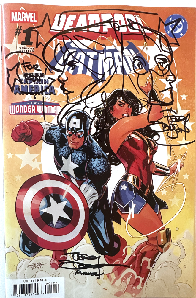 Deadpool/Batman will be written by Zeb Wells and drawn by industry superstar Greg Capullo. Backup stories include Daredevil and Green Arrow by Kevin Smith and Adam Kubert; Jeff the Land Shark and Krypto by Kelly Thompson and Gurihiru; and the Terry and Rachel will be doing a full color 8 page story Captain America and Wonder Woman with Chip Zdarsky, reflected in the variant cover by Terry and Rachel Dodson.